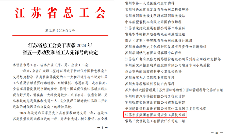 | 日前,江蘇省總工會發(fā)布關(guān)于表彰2024年省五一勞動獎和省工人先鋒號的決定,江蘇宏寶集團有限公司宏寶工具技術(shù)部光榮上榜! |
