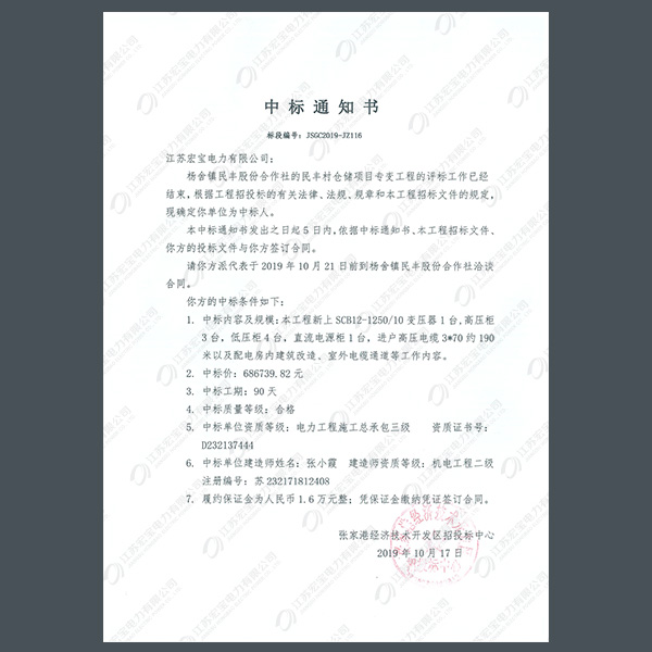 高低壓柜中標(biāo)通知書